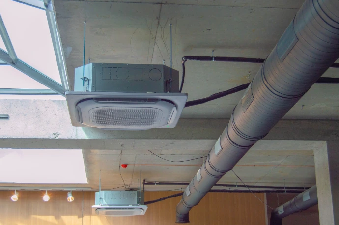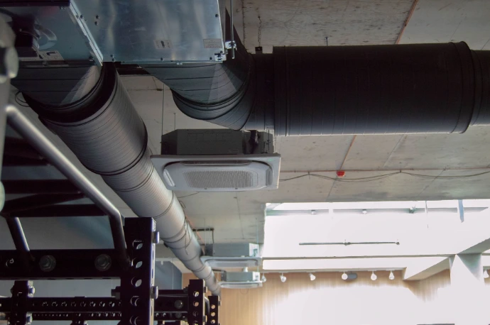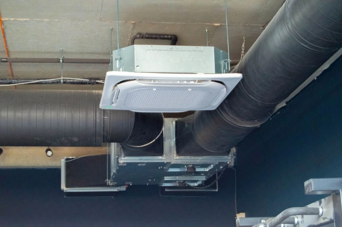 დარბაზში დამონტაჟდა 5 რეკუპერატორი და 100 კილოვატიანი მიდეას VRF სისტემა 12 შიდა კასეტური ბლოკით.